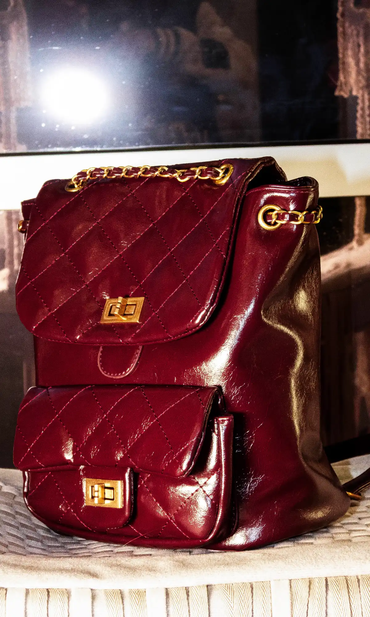 Nuestra mochila está confeccionada en material efecto charol con textura acolchada tipo matelassé, perfecta para elevar cualquier look urbano o chic.