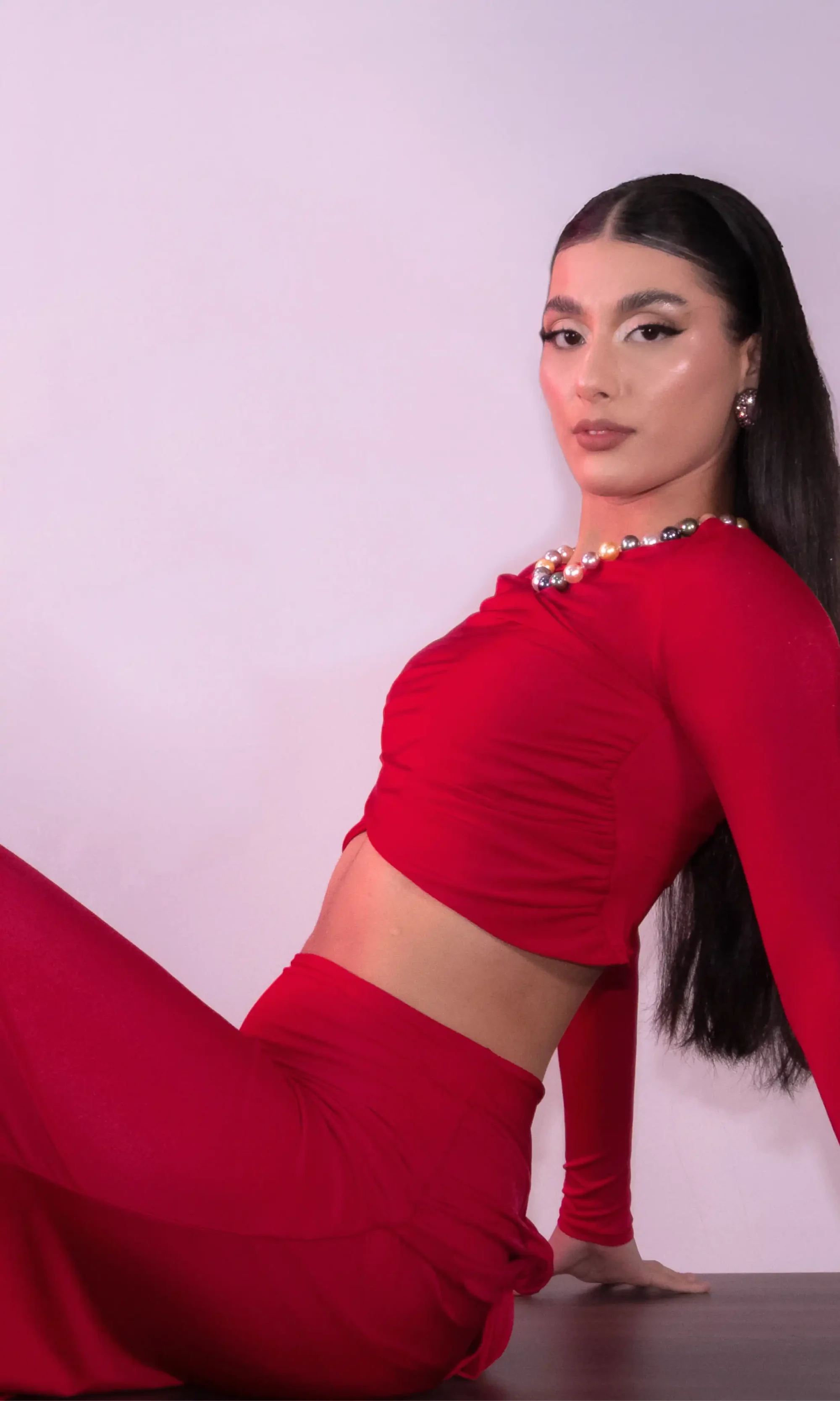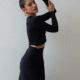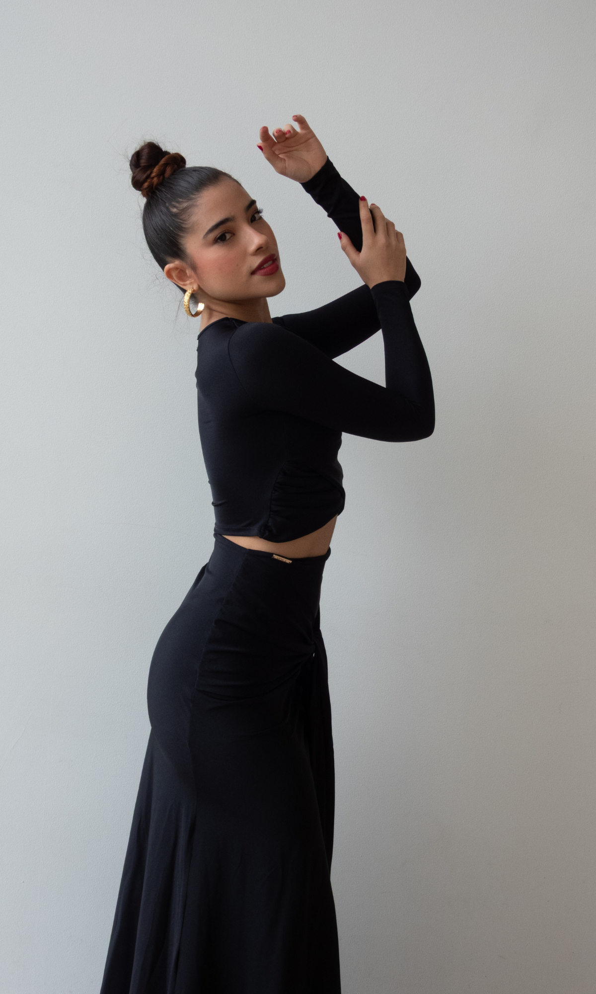 Un set  que combina sensualidad y sutileza en perfecta armonía. El top de manga larga realza la figura con frunces delicados y cortes estratégicos, mientras la falda de caída fluida y drapeado posterior estiliza las curvas con un efecto sofisticado y femenino. Ideal para eventos, cenas especiales o looks donde el lujo se expresa desde la elegancia minimalista. Una pieza que abraza el cuerpo y resalta la silueta con glamour suave y presencia memorable.