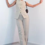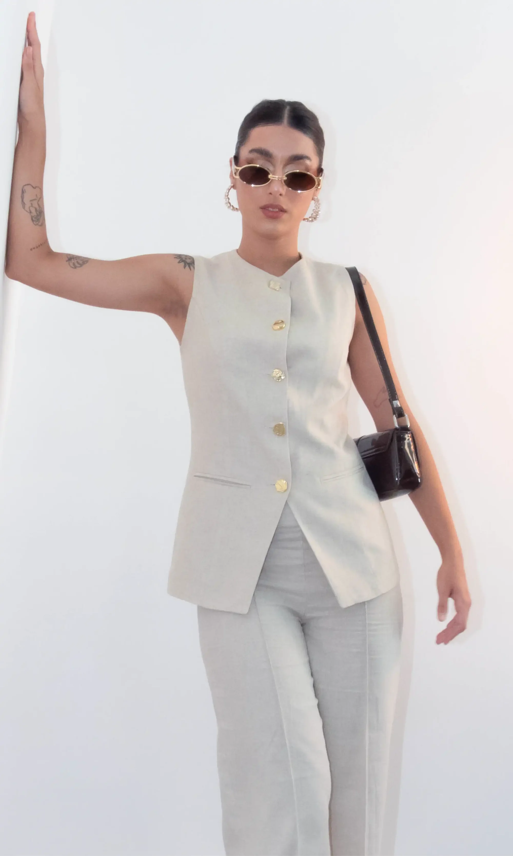 Set de Pantalón Largo y Chaleco con Botones Dorados Color Camel
