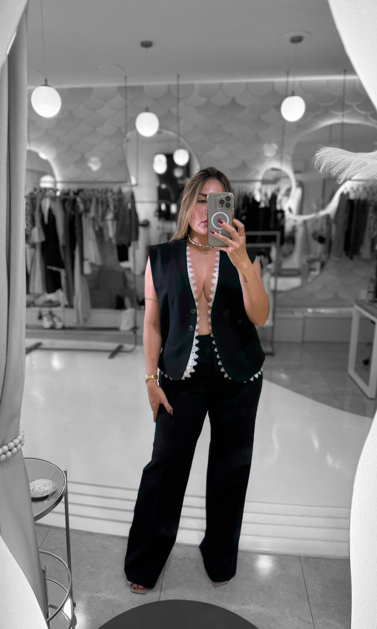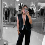 Un look minimalista y elegante con toques de alta clase. El chaleco negro de corte masculino combina a la perfección con la delicadeza del encaje, creando un contraste moderno y chic. Su silueta limpia estiliza y alarga visualmente la figura, mientras el bolso rojo agrega el punto de color perfecto para un acabado audaz y lleno de estilo. Ideal para mujeres seguras que aman la elegancia atemporal con un giro contemporáneo.