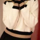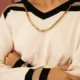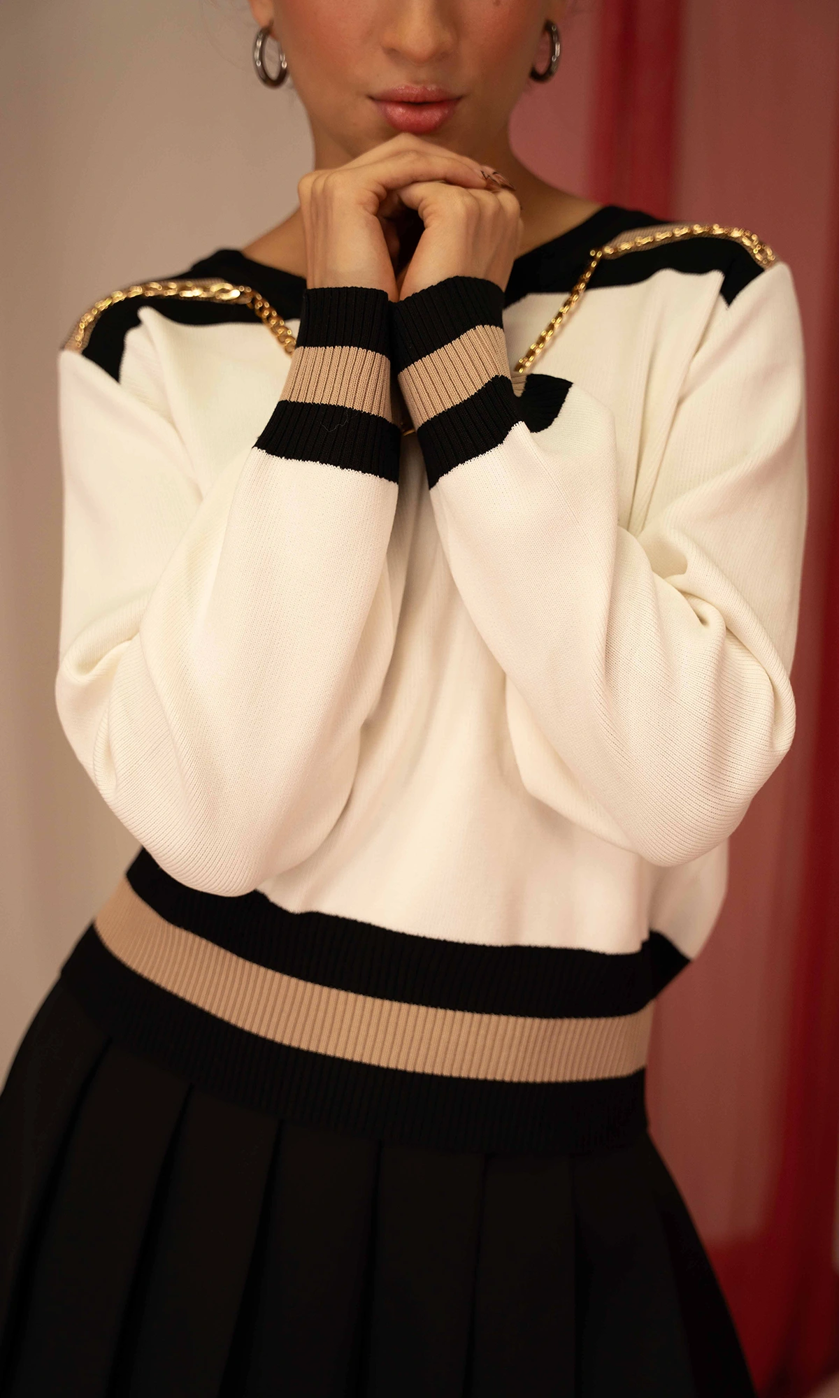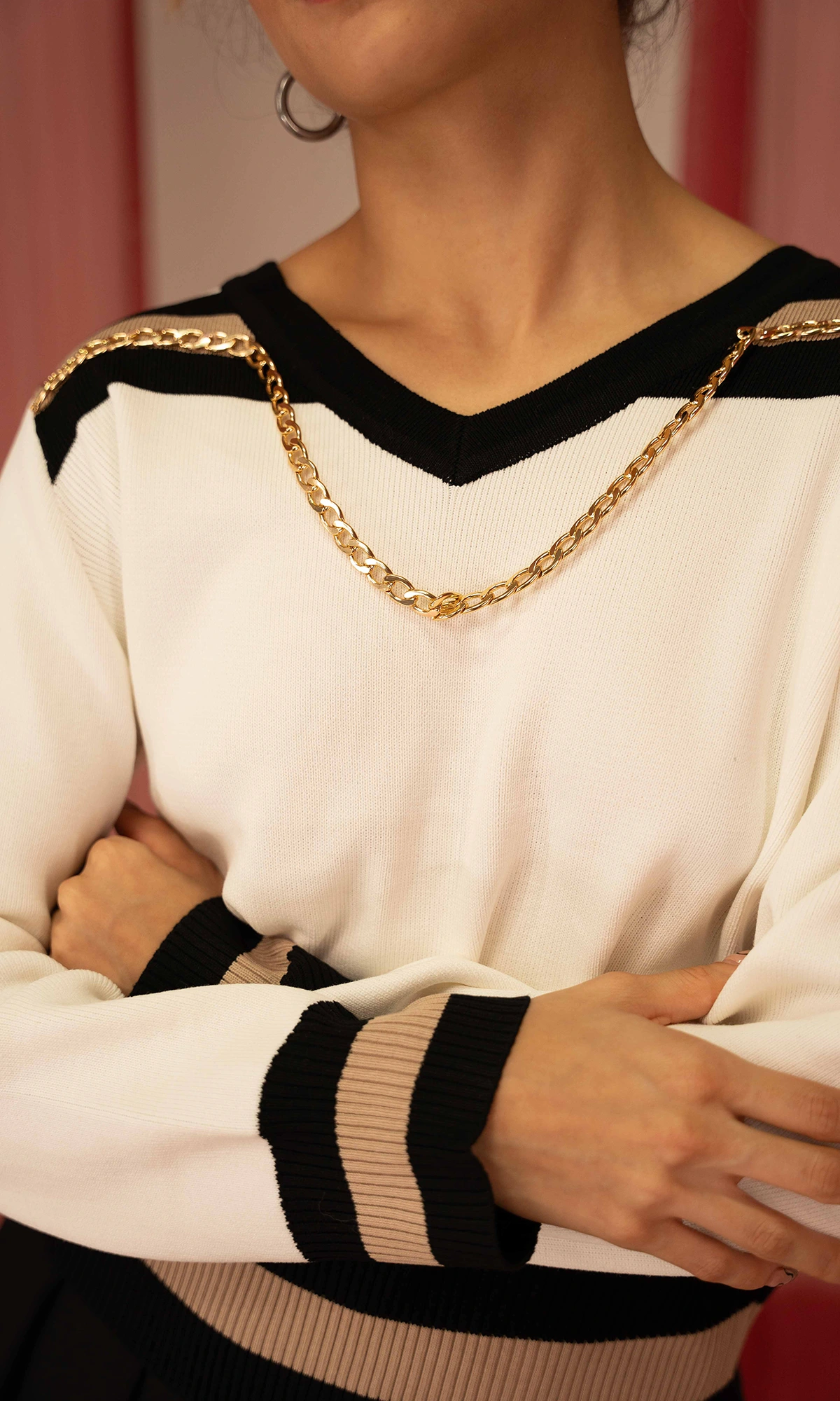 Suéter de punto color blanco con negro y beige, adornado con una cadena dorada.