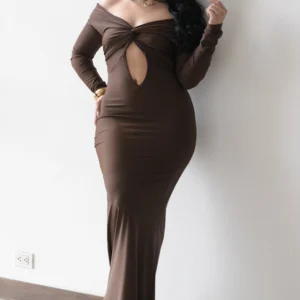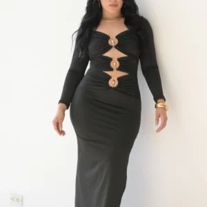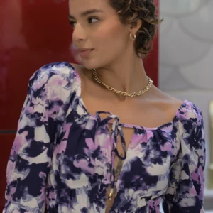 Vestido con escote en v, boleros y cinturón. Color palo de rosa.